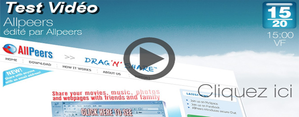 On continue dans notre tournée des 100 meilleurs applications web aux Usa, allpeers vous permet de partager des fichiers que vous avez sur votre ordinateurs, ou meme des images, des sites internet directement a travers un plugin firefox, très simple d’utilisation, un seul glisser-déplacer suffira.Evidemment, c’est efficace, et facile, les mauvais esprits trouveront certainement une utilité à ce petit outil…. il est parfois pas tres rapide, mais les possibilités sont vraiment interessante si vous chercher une methode simple pour s’envoyer dossier et gros fichiers grace au “glisser déplacer” alié à la simplicité de Mozilla Firefox…